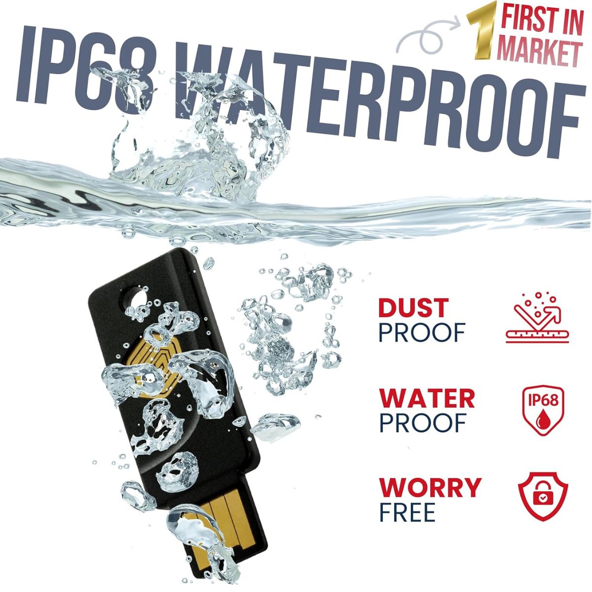 2-Factor Authentication Security Key, Passwordless Authentication, Anti-Phishing, Anti-Hacking, Account Takeover Prevention, Multi-Protocol, FIDO2, U2F, PIV, OTP, OpenSSL Support, USB-A, NFC, IP68 Waterproof, Dustproof.