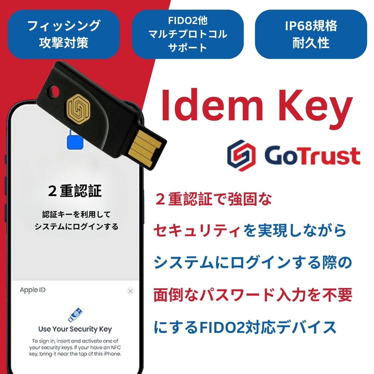 2 要素認証セキュリティ キー、パスワードレス認証、フィッシング対策、ハッキング対策、アカウント乗っ取り防止、マルチプロトコル、FIDO2、U2F、PIV、OTP、OpenSSL サポート、USB-A、NFC、IP68 防水、防塵。